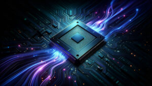 Overhead view of a futuristic computer chip set against a dark background, illuminated by neon blue and purple lights, with swirling patterns of binary code Leave a Comment / By Jared Stevenson / March 6, 2024
