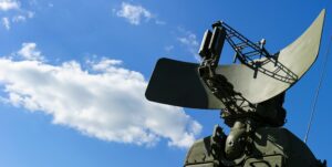Air defense radar of military mobile mighty missile launcher system of green color, modern army industry, white cloud and blue sky on background Leave a Comment / By Jared Stevenson / February 29, 2024