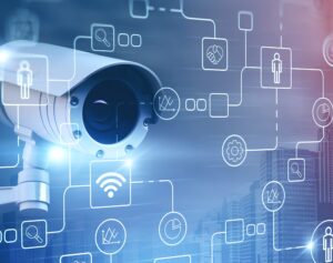 Surveillance street camera in city and icons Leave a Comment / By Jared Stevenson / February 29, 2024