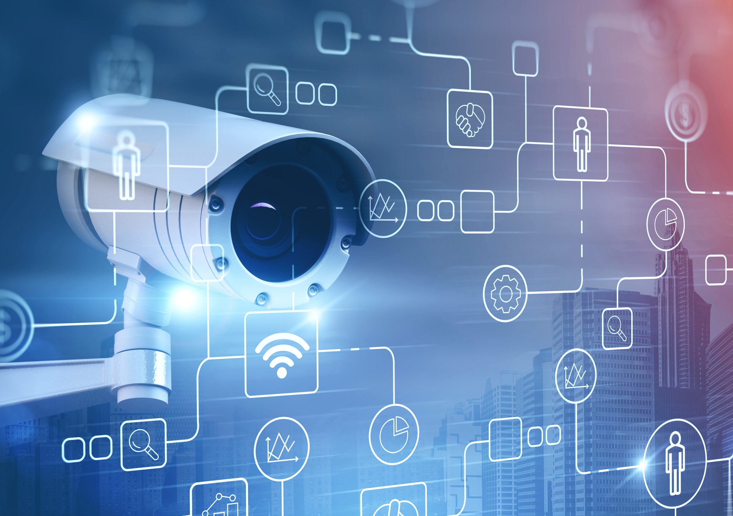 Surveillance street camera in city and icons Leave a Comment / By Jared Stevenson / February 29, 2024