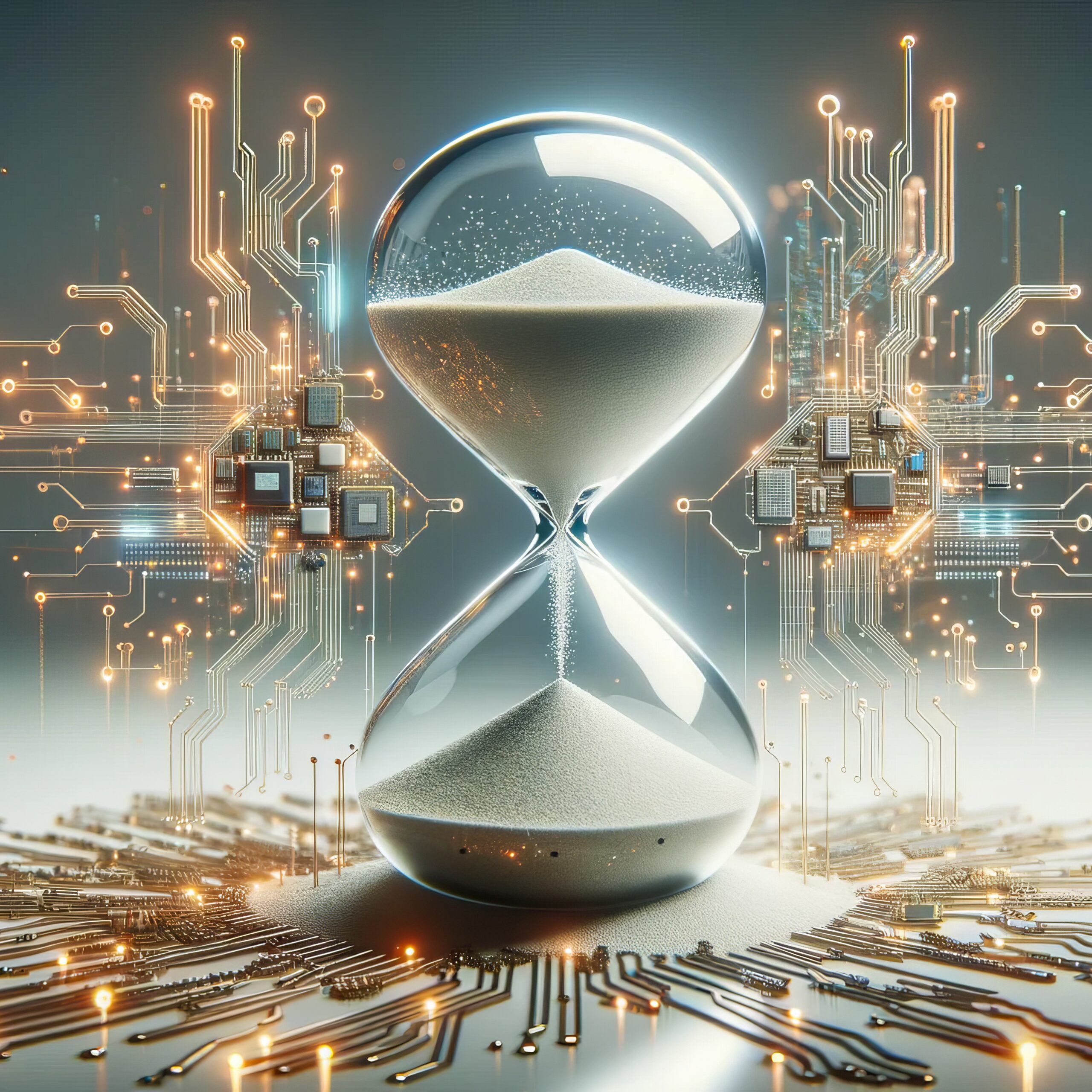 AI-powered hourglass, where the sand grains are tiny microchips and circuits. As the grains fall, they form digital patterns and connections Leave a Comment / By Sunlight / February 27, 2024