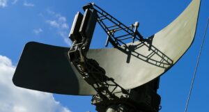 Air defense radar of military mobile mighty missile launcher system of green color, modern army industry, white cloud and blue sky on background Leave a Comment / By Jared Stevenson / March 1, 2024